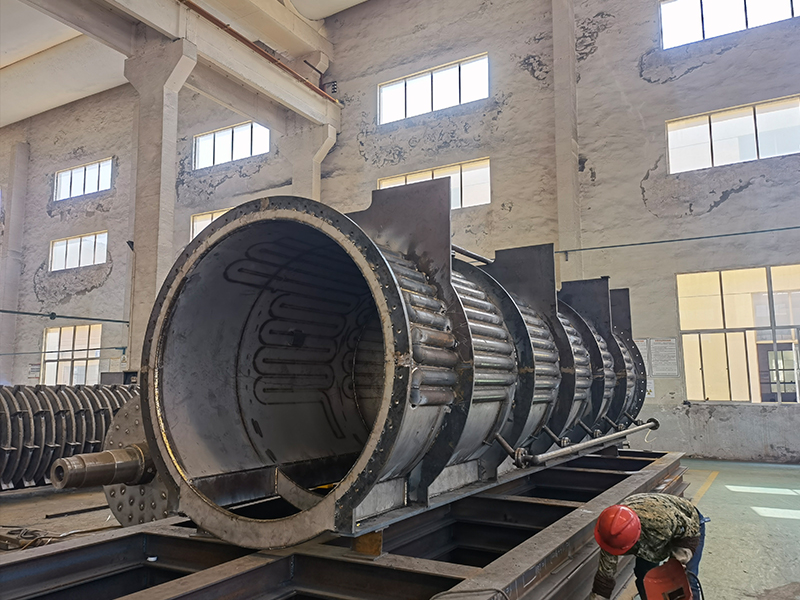 污泥圓盤干燥機與其他間接干燥設備相比具有,傳熱面積大,攪拌效果好,更能促進水分的蒸發(fā)和去除等優(yōu)點,是新開發(fā)的一款改良型簡接加熱干燥機。轉盤式干燥機主要是由定子(外殼),轉子(轉盤)和驅動裝置組成。轉子中心軸是干化轉盤的承載部件,它是一個中空軸,所有的轉盤焊接在這個空軸上。圓盤干燥機通過轉盤邊緣的推進/攪拌器的作用,污泥被均勻緩慢地輸送通過整個干燥機,并通過與轉盤的熱接觸被干化。